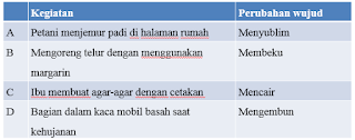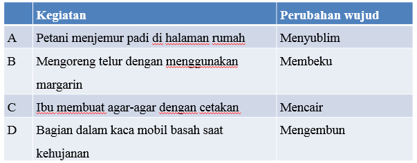 Berdasarkan tabel tersebut, pasangan kegiatan dan perubahan wujud yang tepat adalah . . . .