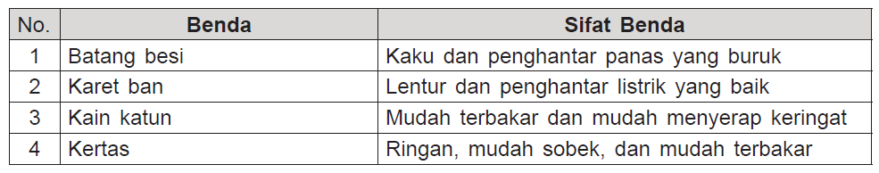 Berdasarkan tabel tersebut, pasangan benda dan sifatnya yang tepat adalah . . . .
