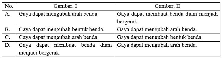 Gambar I merupakan gaya dapat merubah arah benda sedangkan gambar II gaya dapat membuat benda diam menjadi bergerak.