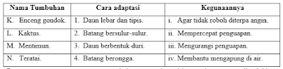 Pasangan yang tepat antara nama tumbuhan, cara adaptasi beserta kegunaanya ditunjukkan pada nomor. . . .