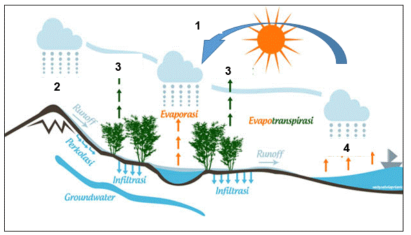 a. 1 = kondensasi, 2 = evaporasi, 3 = presipitasi, dan 4 = transpirasi
