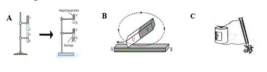 Cara membuat magnet sesuai dengan gambar A, B, dan C secara berurutan adalah….