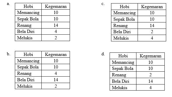 49. Data kegemaran 40 anak di Kampung Baru sebagai berikut, yaang suka memancing 10 anak, sepak bola 10 anak. Renang 4 anak, bela diri 14 anak dan melukis 2 anak.